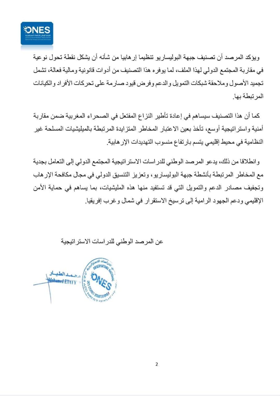 ودعا المرصد الوطني للدراسات الاستراتيجية المجتمع الدولي إلى التعامل بجدية مع المخاطر المرتبطة بأنشطة جبهة البوليساريو، وتعزيز التنسيق الدولي في مجال مكافحة الإرهاب وتجفيف مصادر الدعم والتمويل التي قد تستفيد منها هذه الميليشيات، بما يسهم في حماية الأمن الإقليمي ودعم الجهود الرامية إلى ترسيخ الاستقرار في شمال وغرب إفريقيا.