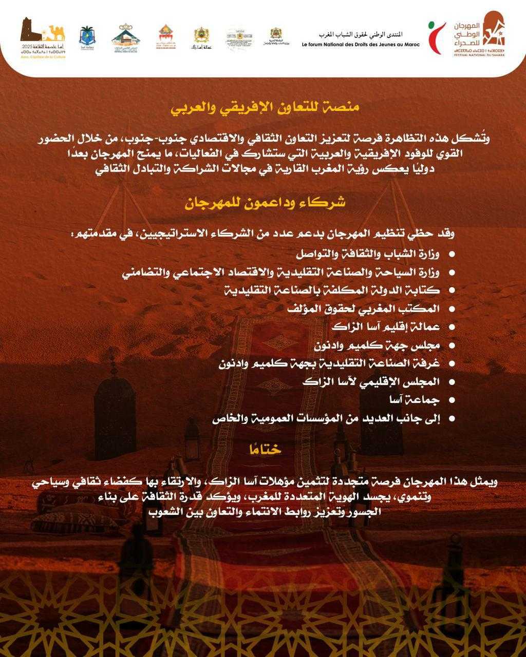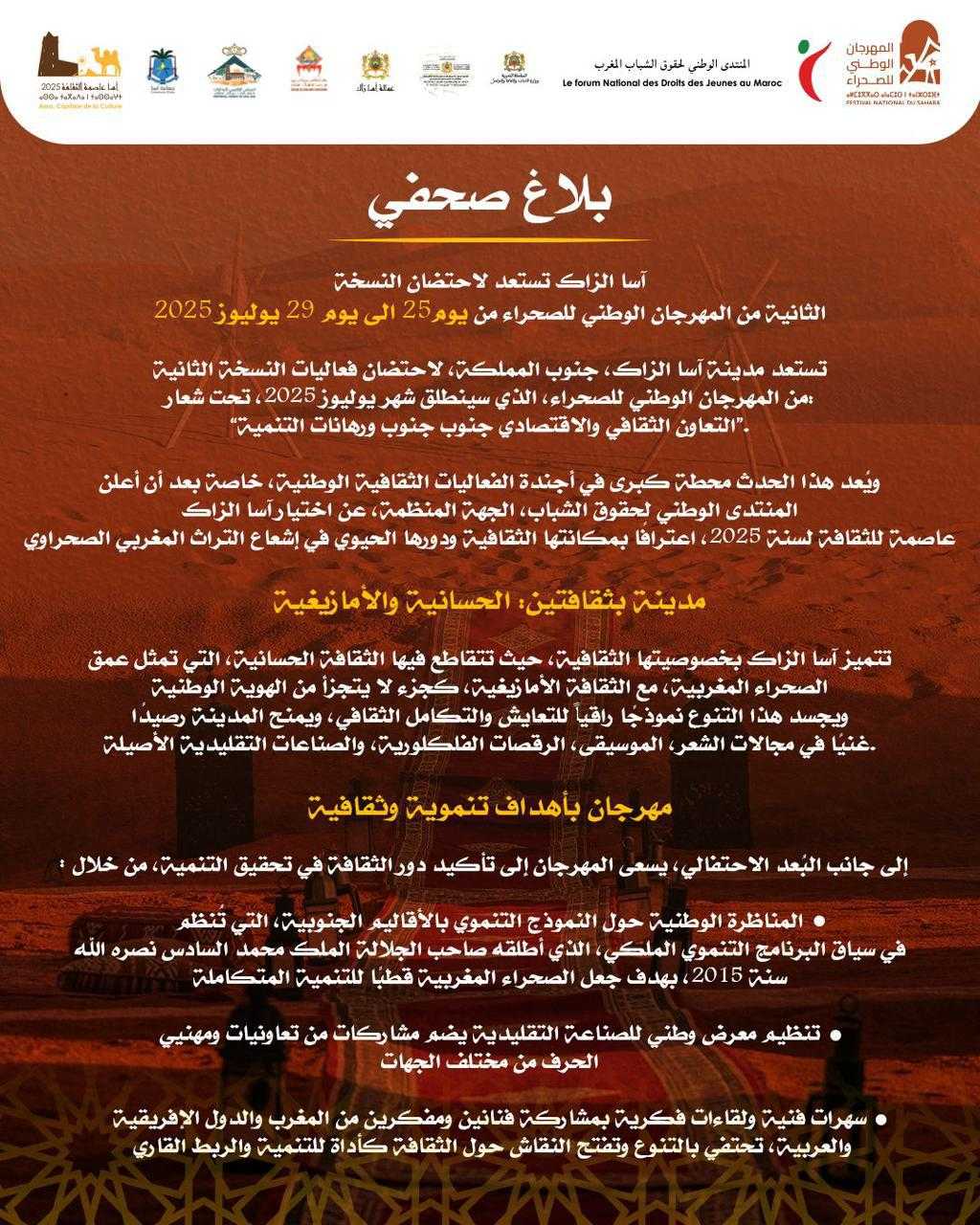 تستعد مدينة آسا الزاك، لاحتضان فعاليات النسخة الثانية من المهرجان الوطني للصحراء، خلال الفترة الممتدة من 25 إلى 29 يوليوز 2025، تحت شعار: “التنوع الثقافي والاقتصادي، رافعة لتثمين الجنوب ورهان للتنمية.”
