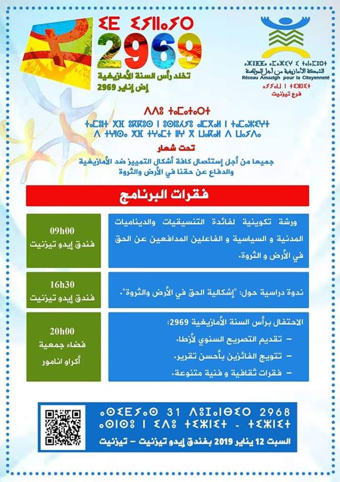 وحسب بلاغ للشبكة، تأتي هذه الندوة المنظمة تحت شعار: “جميعا من أجل استئصال كافة أشكال التمييز ضد الأمازيغية، والدفاع عن حقنا في الأرض و الثروة” تزامنا مع العيد الوطني الأمازيغي إيناير 2969، “الذي هو رمز التشبث بتراب الوطن والاحتجاج الصارخ ضد جميع أشكال التمييز العنصري ضد الأمازيغية”، وفي إطار مهامها النضالية من أجل المرافعة ضد سياسة نزع الأراضي للسكان الأصليين، وما يترتب عنها من تهجير وحرمان من الحقوق الاقتصادية والاجتماعية والثقافية.