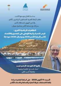 في مبادرة نوعية تفتح آفاق التفكير في الأبعاد الاقتصادية والاجتماعية للرياضة، تنظم الرابطة المغربية للصحافيين الرياضيين بأكادير والنادي الجهوي للصحافة، بشراكة مع جماعة أكادير، محاضرة فكرية وعلمية تحت عنوان: التظاهرات الرياضية الكبرى، فرص التنمية وأثرها الإيجابي على المجتمع والاقتصاد، “كأس إفريقيا للأمم 2025 ومونديال 2030 نموذجاً”.