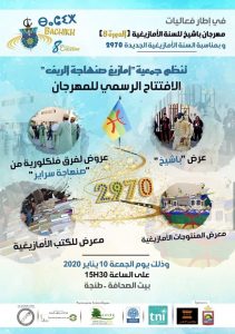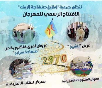 بمناسبة حلول السنة الأمازيغية الجديدة 2970، تنظم جمعية “أمازيغ صنهاجة الريف” الدورة 8 لمهرجان “باشيخ” للسنة الأمازيغية، تحت شعار: ” الأمازيغية: رمز للتلاقح الثقافي والتعايش الديني”، و ذلك أيام 10-11- 12 يناير 2020 بمدينة طنجة.