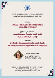 وذلك يوم الخميس 13 نونبر 2025، الساعة 3:00 مساء، وتهدف هذه المحاضرة الى تعزيز التنوع اللغوي من خلال تأليف كتب تعليمية موجهة للصغار باللغات المحلية، لجعله رافعة تنمية تساهم في تنمية قدرات الناشئة على الابداع وخلق الاحتكار في عدة مجالات.