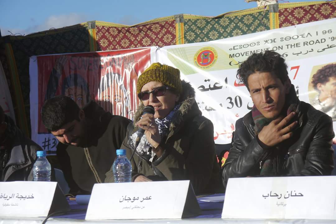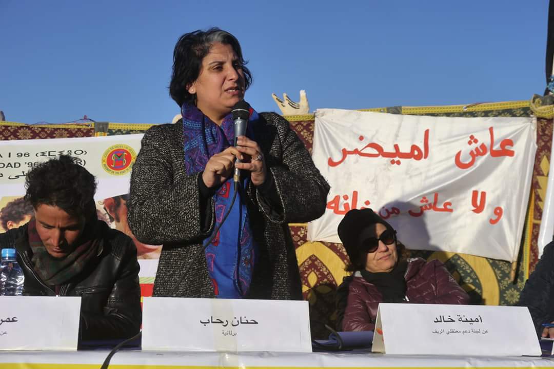 ✔ في مداخلة البرلمانية حنان رحاب في نفس الندوة، تحدثت عن مؤسسات الدولة وعلاقتها مع حقوق الإنسان ،وبادرت بالوقوف في مداخلتها واصفة تصرفها بالإحترام لمعتصم ألبان ونضالهم المشروع، ومقاومتهم لهذا المناخ الصعب والمتقلب ،مضيفة ” أقف إجلال واحترام لصمود نساء ألبان، أقف إجلال واحترام لشباب المعتصم القوي، كنت قد زرت معتصما ألبان سنة 2012 بصفتي انذاك صحفية وحقوقية، لأقف اليوم أمامكم بصفتي برلمانية، وأرى تلك الوجوه رغم مرور سنوات، لا زالت صامدة واقفة بعزم رغم السنوات ،رغم الإعتقالات”.