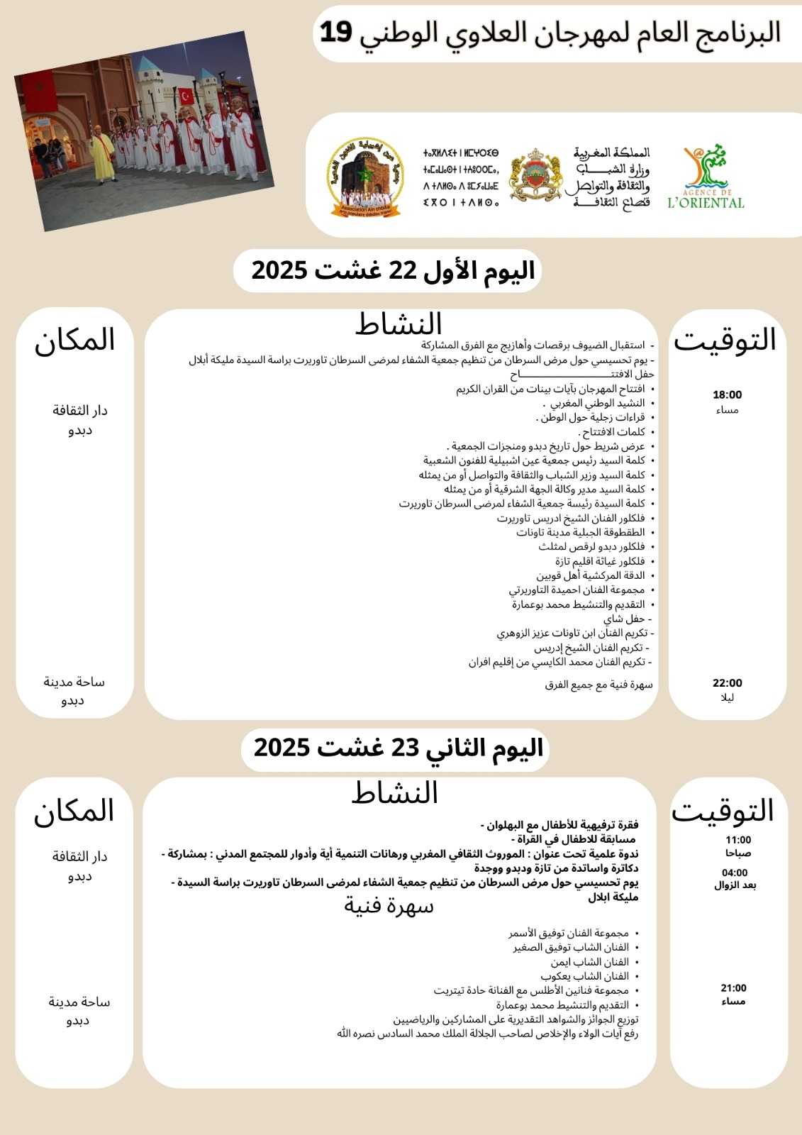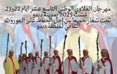 بمناسبة ثورة الملك والشعب تعلن جمعية عين اشبيلية للفنون الشعبية عن تنظيم الدورة التاسعة عشرة لمهرجان العلاوي تحت شعار “جميعا للحفاظ على الموروث الثقافي لمنطقة دبدو “، وذلك في الفترة الممتدة من 22و23 غشت 2025 بمدينة دبدو. ويتضمن برنامج هذه الدورة أنشطة متنوعة ومتميزة فنية وثقافية بمختلف فضاءات المدينة، بدعم وبشراكة مع وزارة الشباب والثقافة والتواصل، وكالة الانعاش والتنمية الاقتصادية والاجتماعية لعملات واقاليم جهة الشرق ، ، مهرجان “العلاوي” احتفال دأبت جمعية عين اشبيلية بمعية شركائها على تنظيمه مند سنة 2005، ويهدف إلى إبراز المؤهلات الثقافية والتراثية والطبيعية التي تزخر بها المدينة والترويج للسياحة الداخلية والجبلية، والتعريف بمدينة دبدو التاريخية وإحياء ذكرى معركة علوانة وبني ريص الذين قاوموا المستعمر الفرنسي في 15 و23 مايو 1911 .