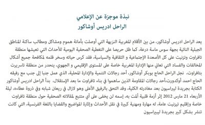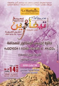تعلن لجنة الإشراف عن أسماء الصحفيين الحائزين على جائزة أوشاكور للصحافة لسنة 2019، بأنواعها الأربعة، ليلة يوم السبت 24 غشت 2019، وستسلم لهم جوائز قيمة خلال السهرة الختامية التي ستقام في نفس الليلة بساحة محمد السادس بتافراوت. وعلى من تتوفر فيه شروط المشاركة لنيل جائزة أوشاكور للصحافة، أن يرسل مشاركته عبر البريد الالكتروني: ouchagorprix@gmail.com أو عبر البريد العادي على العنوان التالي: جمعية فستيفال تيفاوين، صندوق البريد رقم 8، الرمز البريدي 85450، تافراوت، إقليم تزنيت ولمزيد من المعلومات المرجو الإتصال بلجنة الإشراف على الأرقام التالية: 0661767073 -0661415026