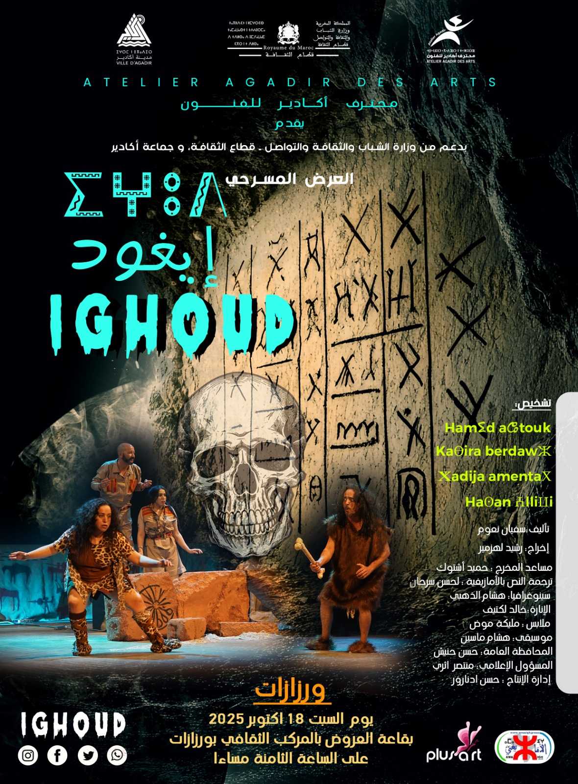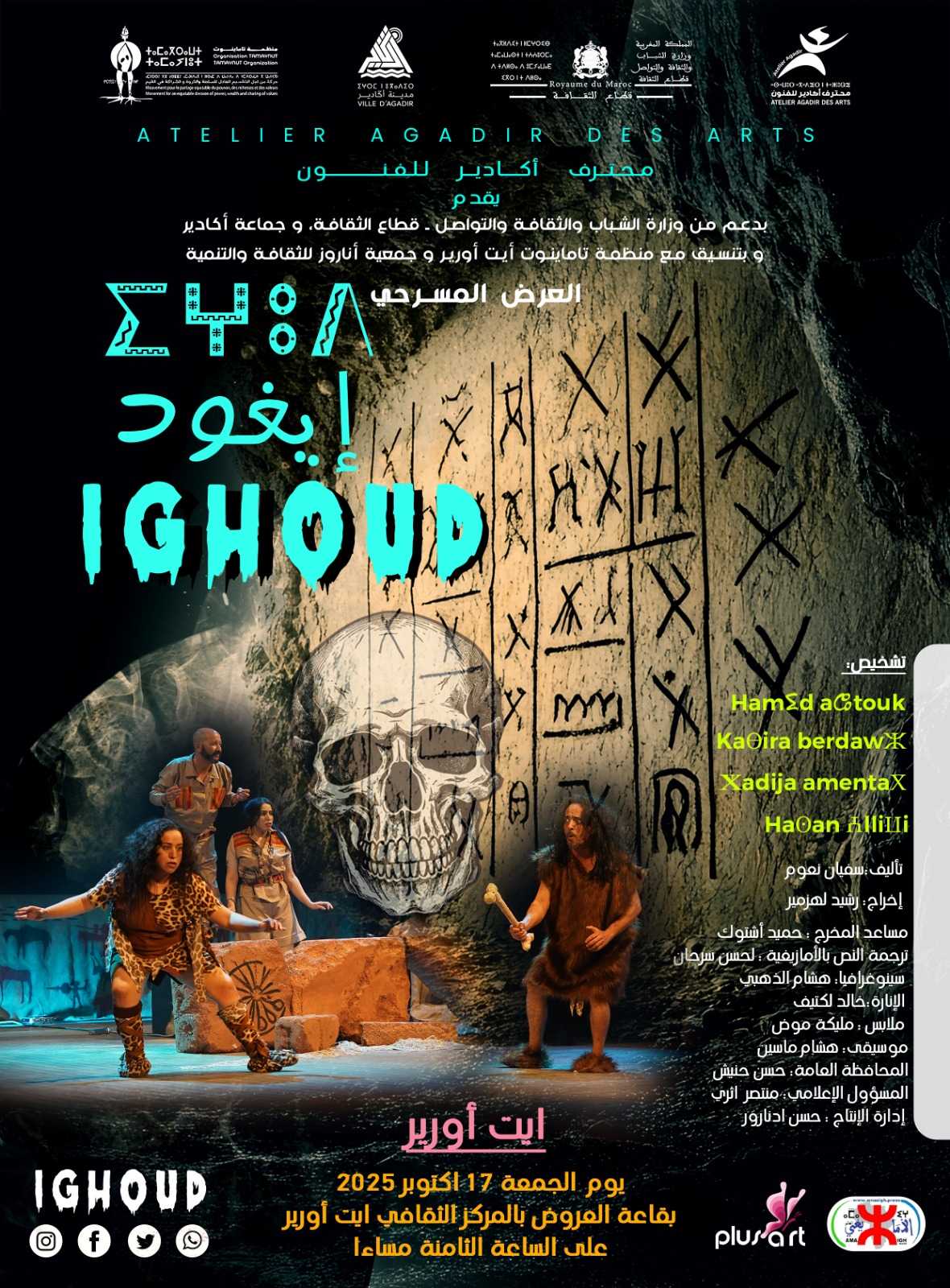 المسرحية، التي تحمل اسمها من الموقع الأثري الشهير “إيغود”، تقدم رؤية فنية معاصرة تستلهم التاريخ والهوية في قالب يجمع بين الكوميديا السوداء والعبث والفلسفة. وتطرح أسئلة حول الذاكرة الجماعية والواقع الاجتماعي بأسلوب نقدي ساخر، يقدمه فريق من الممثلين المتميزين: حميد اشتوك، كبيرة البرداوز، حسن عليوي، وخديجة أمنتاك.