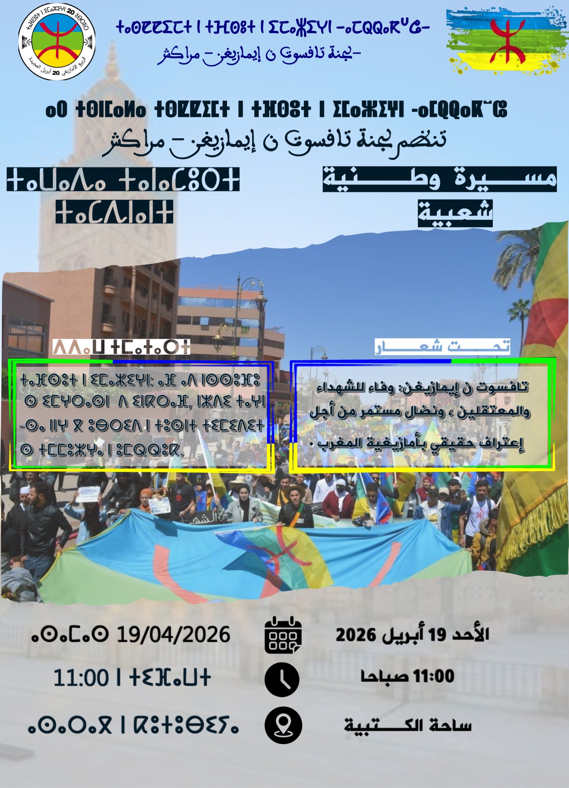 واختتمت اللجنة بيانها بالتأكيد على مواصلة النضال السلمي كخيار استراتيجي، من أجل انتزاع الحقوق وصون المكتسبات، مع الدعوة إلى تعبئة واسعة لإنجاح مسيرة 19 أبريل 2026، باعتبارها محطة رمزية في مسار الحركة الأمازيغية بالمغرب.