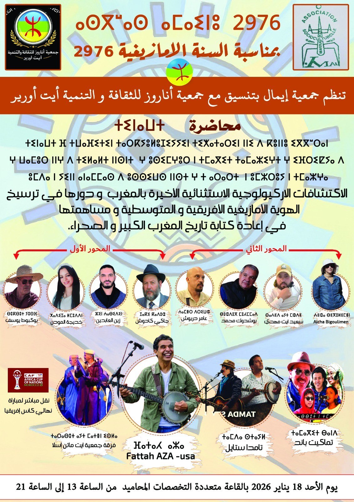 بمناسبة حلول السنة الأمازيغية الجديدة 2976، تنظم جمعية إيمال بتنسيق مع جمعية أناروز للثقافة والتنمية – آيت أورير، يوم الأحد 18 يناير 2026، فعاليات ثقافية وفنية متنوعة، وذلك بالقاعة متعددة التخصصات بالمحاميد، ابتداءً من الساعة الواحدة زوالًا إلى غاية التاسعة ليلًا.