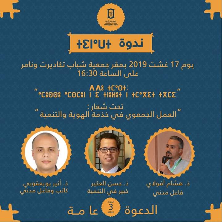 وفي 17 غشت سيتم تنظيم ندوة فكرية تحت شعار “العمل الجمعوي في خدمة الهوية والتنمية” من تأطير كل من الأستاذ هشام أفولاي (إطار بمنظمة تماينوت) والأستاذ الجامعي أنير بويعقوبي والخبير في التنمية الحسن العكير.