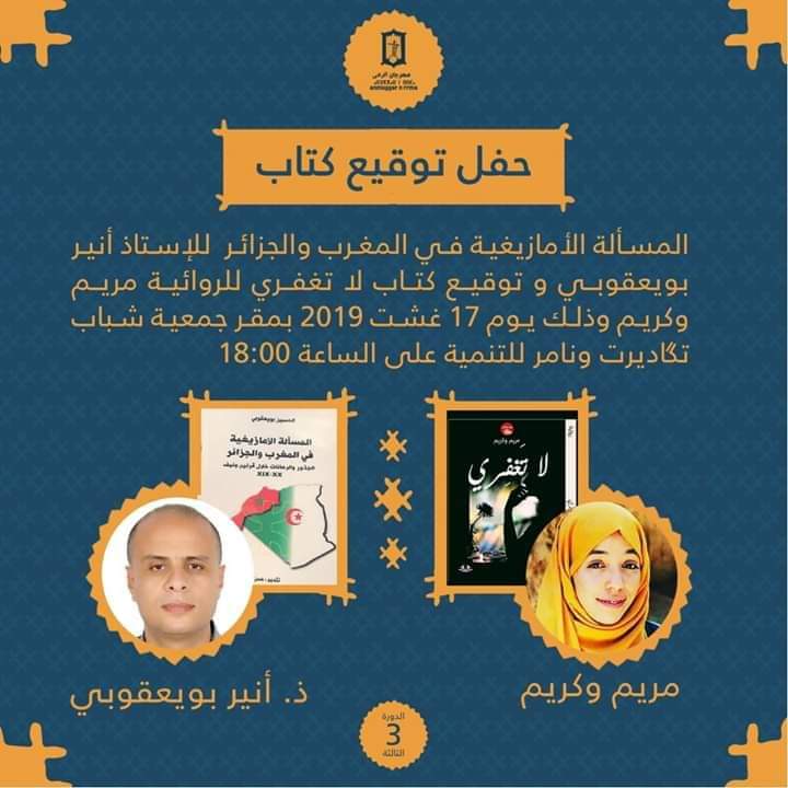 كما سينظم على هامش الندوة حفل توقيع كتاب كل من الروائية مريم واكريم لكتابها “لا تغفري” وكتاب الأستاذ أنير بويعقوبي الحامل لعنوان “المسألة الأمازيغية في المغرب والجزائر”،