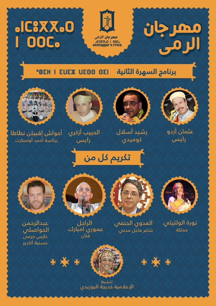وحسب البلاغ يتضمن برنامج المهرجان العديد من المفاجآت والعديد من الفقرات المتنوعة أبرزها أمسيات موسيقية على مدى ليلة 16 و17 غشت، التي ستحييها كل من فرقة أرشاش ثنائي الكوميديا أجفرار ( أحمد نتاما )، الرابور إگيك موح، فرقة أحواش إقبيلن ن طاطا ومشاركة كل من الشاعر الحبيب أزكري وعثمان أزدو والكوميدي رشيد أسلال كما سيقوم بتنشيط الحفل كل من الإعلامي يونس مزيه والإعلامية خديجة البوزيدي.