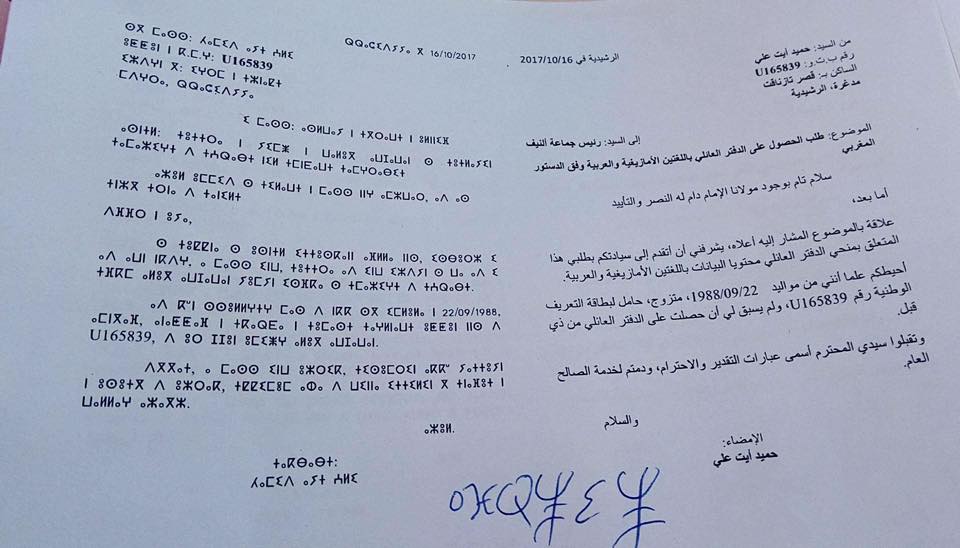 وتقدم الناشط “أفرزيز” الذي يقطن بمنطقة النيف، إقليم الراشيدية بطلب مكتوب باللغتين الرسميتين للمغرب، أول أمس الاثنين، إلى رئيس جماعة “النيف” يشترط فيه الحصول على بيانات دفتر الحالة المدنية، مطالبا “بتطبيق الدستور المغربي الذي نص على رسمية في فصله الخامس على رسمية الأمازيغية، والحصول على الدفتر العائلي يتضمن البيانات باللغة الأمازيغية إلى جانب اللغة العربية.”