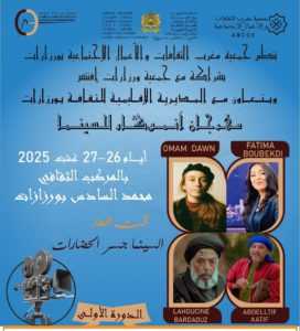 تحت شعار السينما جسر الحضارات، يحتضن المركب الثقافي محمد السادس بمدينة ورزازات يومي 26 و27 غشت 2025، فعاليات الدورة الأولى لمهرجان أنموكار للسينما.