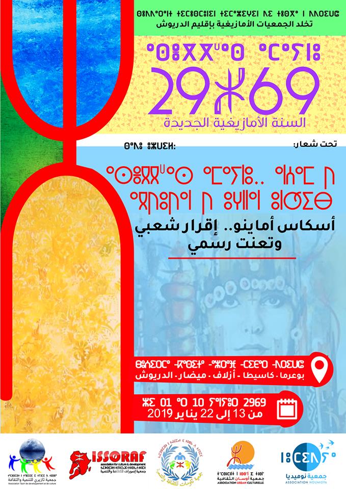 تخلد الجمعيات الأمازيغية بإقليم الدريوش السنة الأمازيغية الجديدة 2969 تحت شعار: “أسكاس أماينو.. إقرار شعبي وتعنت رسمي”، وذلك من 13 إلى 22 يناير 2019، بكل من بوعرما، كاسيطا، أزلاف، ميضار والدريوش.