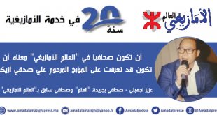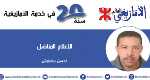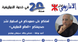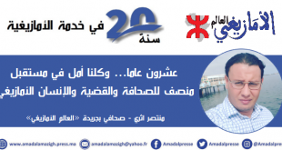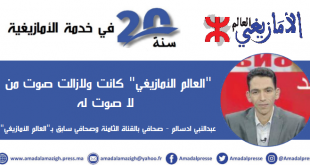 عبدالنبي ادسالم – صحافي بالقناة الثامنة وصحافي سابق بـ«العالم الأمازيغي»: «العالم الأمازيغي» كانت ولازالت صوت من لا صوت له الحديث عن جريدة «العالم الأمازيغي» في ذكراها العشرون لتأسيسها هو حديث عن جزء لا يتجزأ من النضال الأمازيغي، ذلك ما للإعلام من أدوار شتى وأهمها توصيل خطاب ومطالب أية حركة للجمهور …
